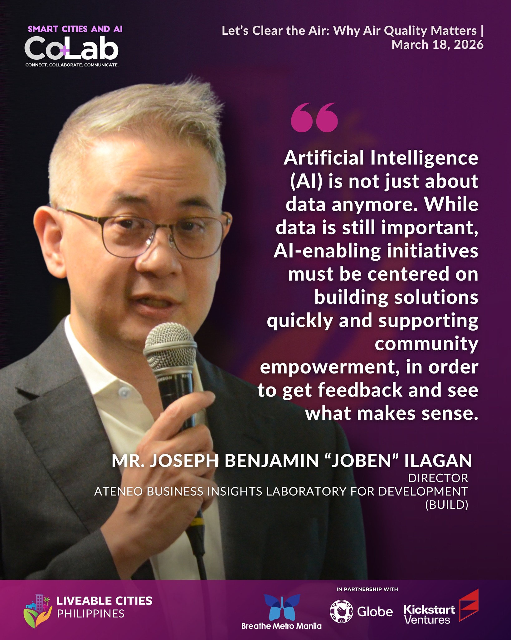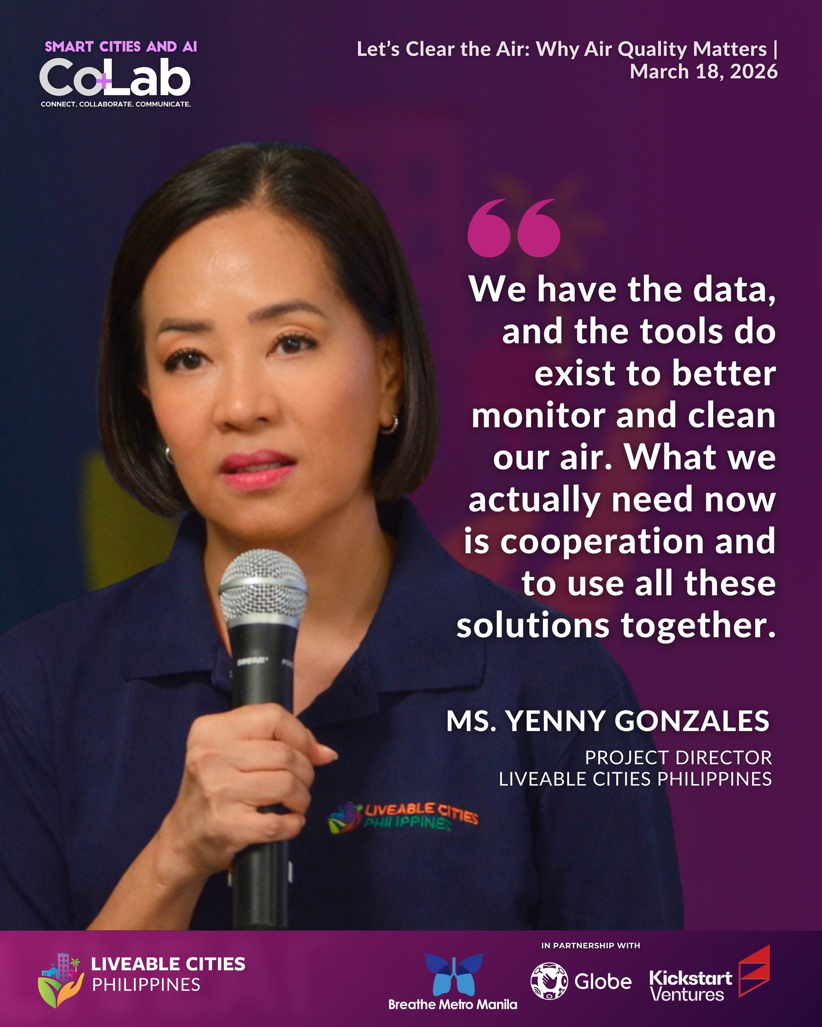 On March 18, Liveable Cities Philippines officially launched its new program, Liveable Cities Co+Lab—a collaboration platform that brings together local governments, companies, and institutions to turn ideas into real-world solutions. It focuses on three key areas: Circular Cities, Smart and AI Cities, and New Mobility. The first session under Smart and AI Cities focused on air quality in the Philippines, highlighting how better data, stronger city leadership, and emerging technologies can drive meaningful improvements in urban environments, with insights from Dr. James Simpas, Dr. Annelle “Ari” Chua, Mr. Joseph Benjamin “Joben” Ilagan, Engr. Ethel Garcia, Ms. Vanessa Claire Vinarao, and Mr. Zebedeo Zeus Liboon, alongside partners committed to building healthier, more liveable cities.